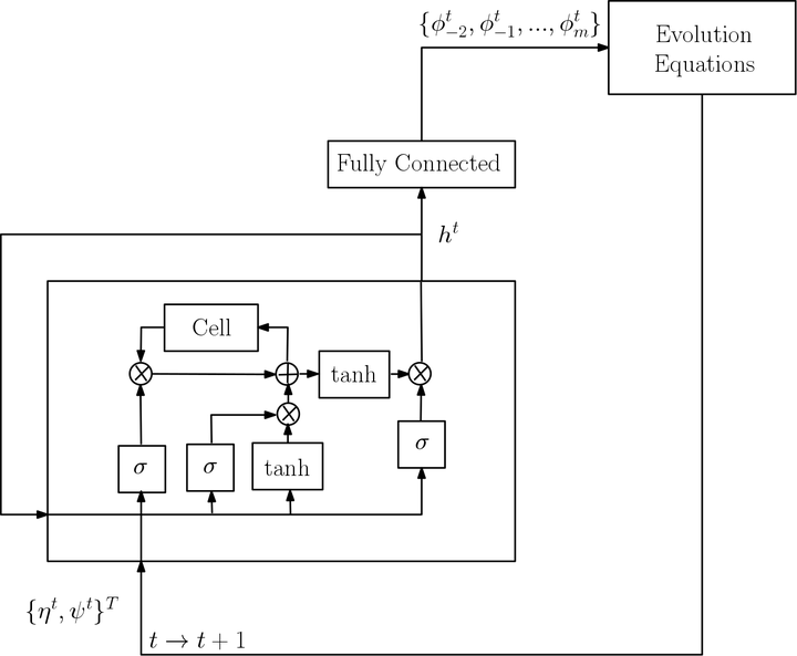 The implemented LSTM-RNN architecture coupled with the evolution equationsThis work studies the implementation of Machine Learning algorithms for solving nonlinear partial differential equations, in a hybrid framework. Specifically, Recurrent Neural Networks (RNN) and Convolutional Neural Networks (CNN) are used to reduce the high computational costs involved in solving such problems. We do not use Neural Nets to perform predictions for next time-steps but to replace the computationally demanding parts of the system. We implement this hybrid approach for the study of the evolution of free-surface waves. As a first test case, we study the propagation of a wave in a periodic cell. For this case we track the conservation errors regarding the time evolution of theproblem. Afterwards we model the reflection of a solitary wave on a vertical wall and compute the force acting on the wall. We also see the effect of varying hyper-parameters on the accuracy of prediction of our neuralnets, and perform leading order FLOP count compar-isons.